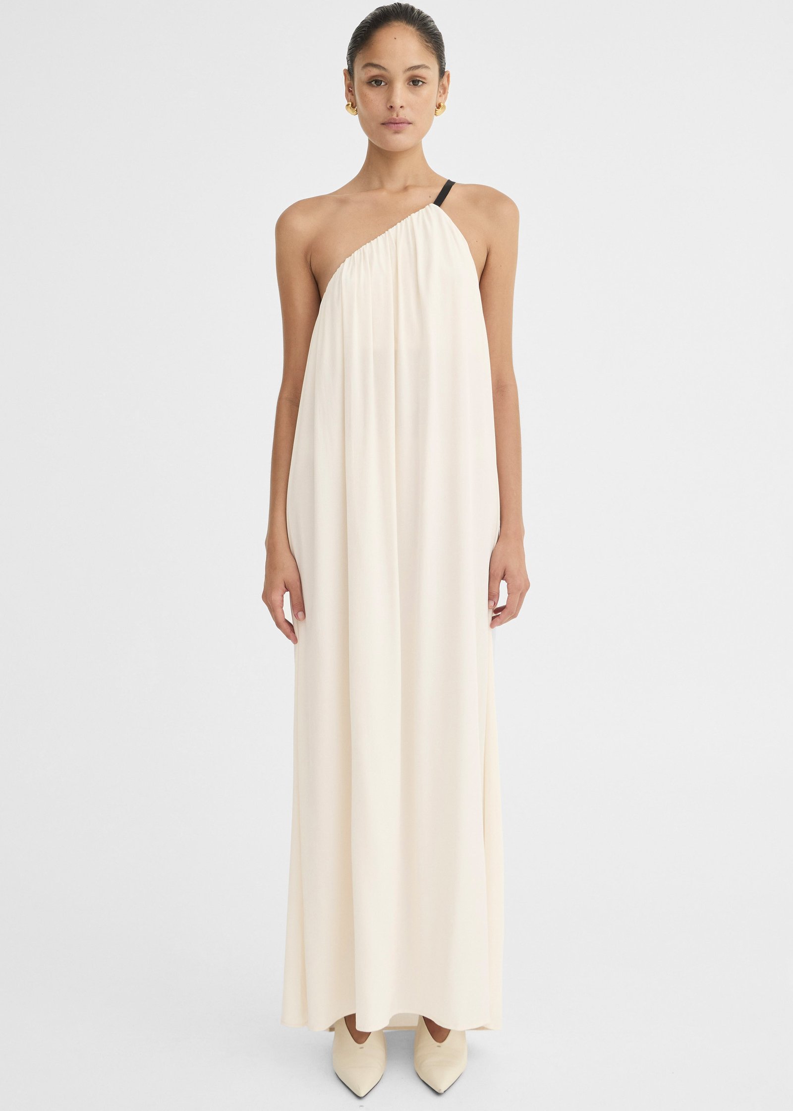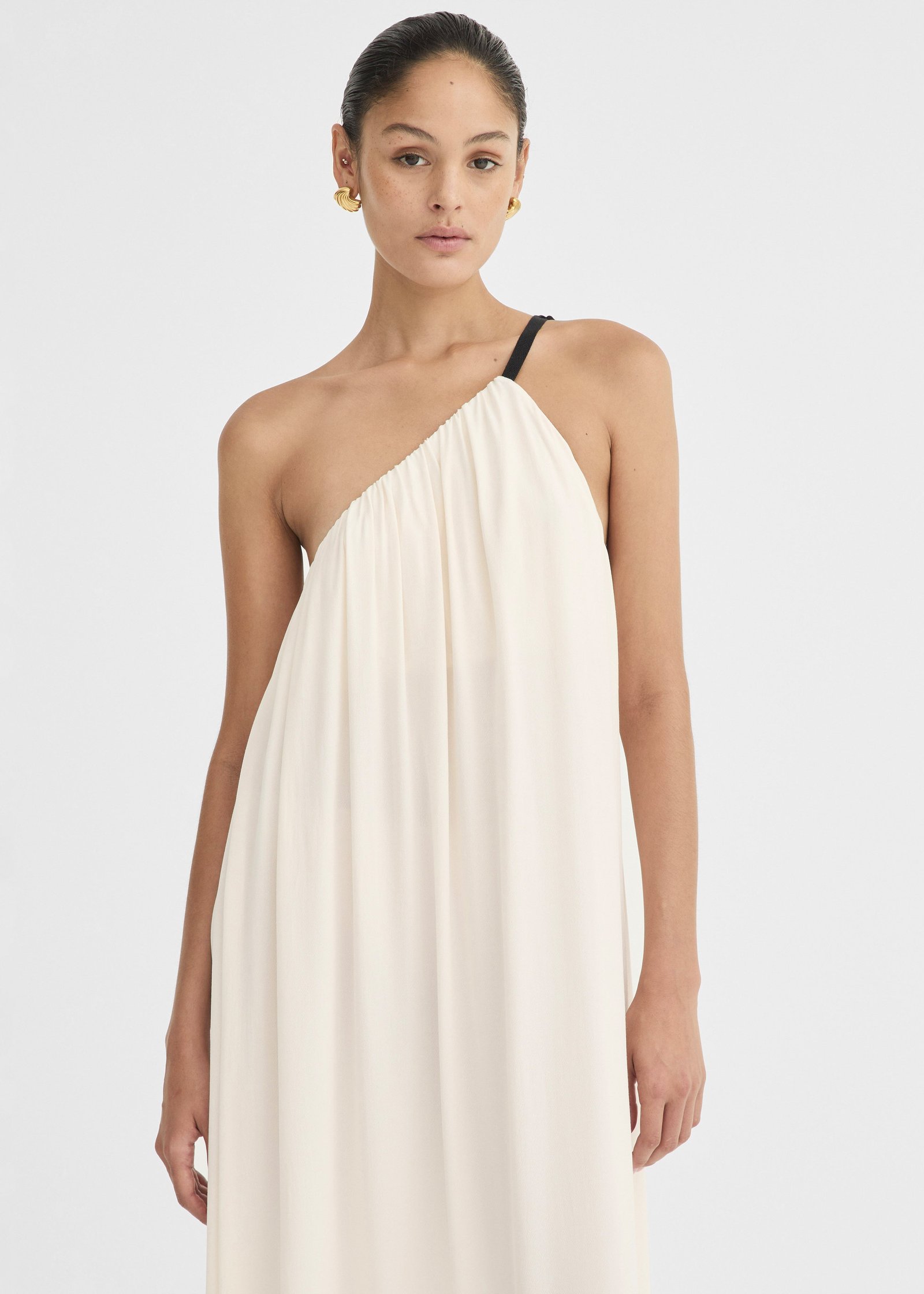 Asymmetric neckline with gathered detail